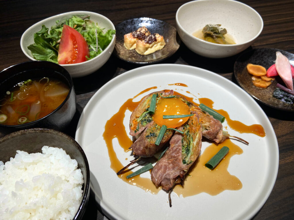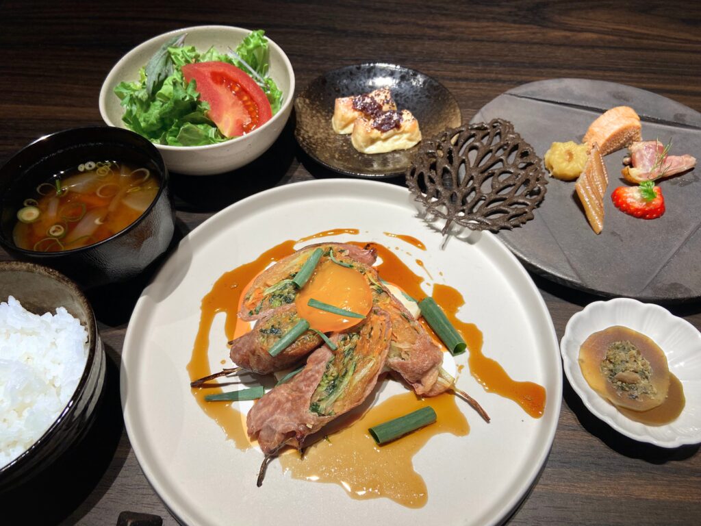 地元の伊賀野菜を伊賀牛で巻き、甘辛いタレとともにやわらかく蒸し焼きに仕上げました。